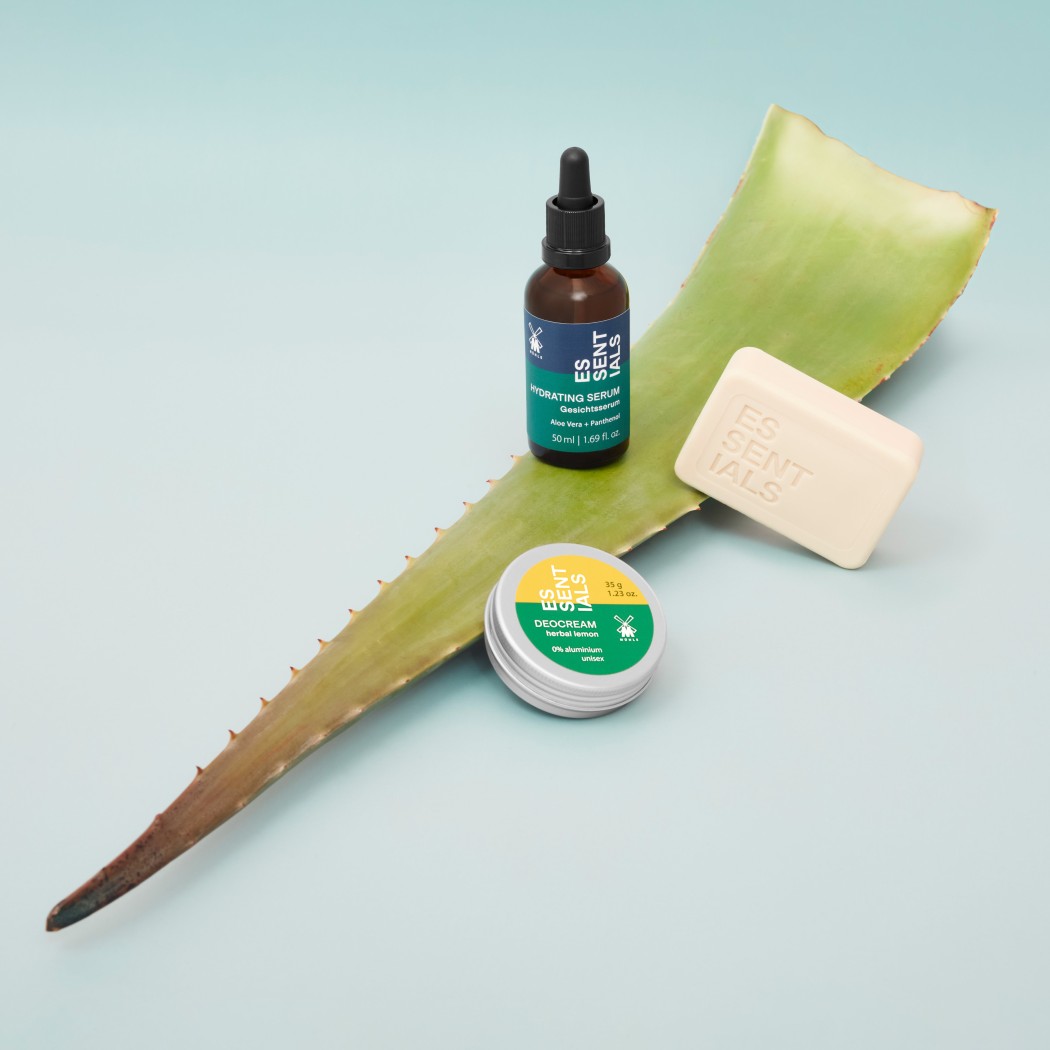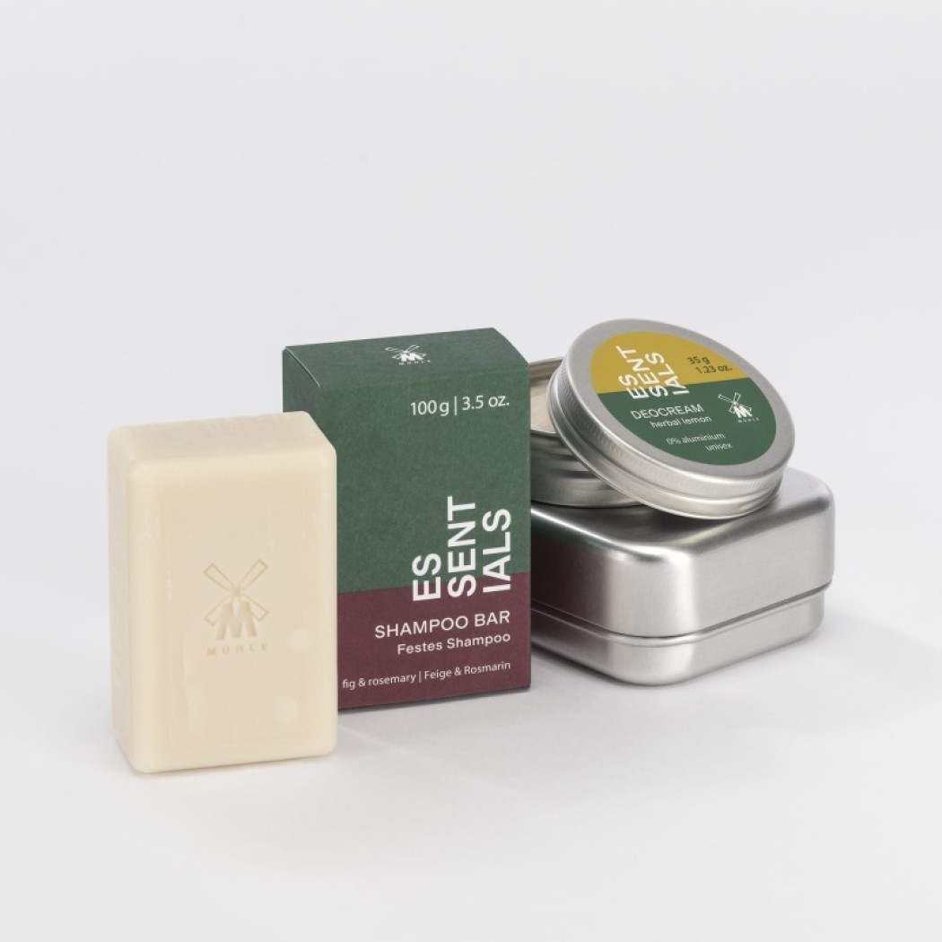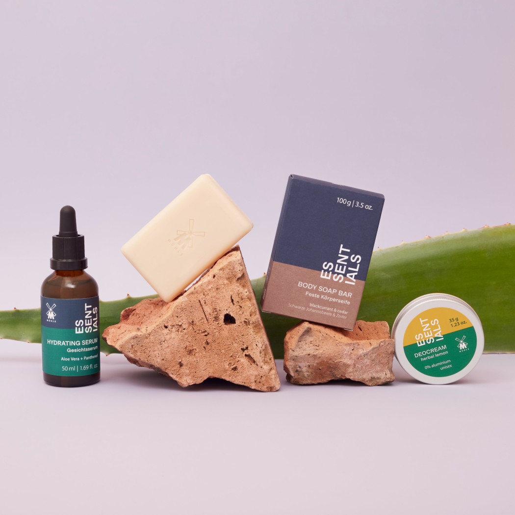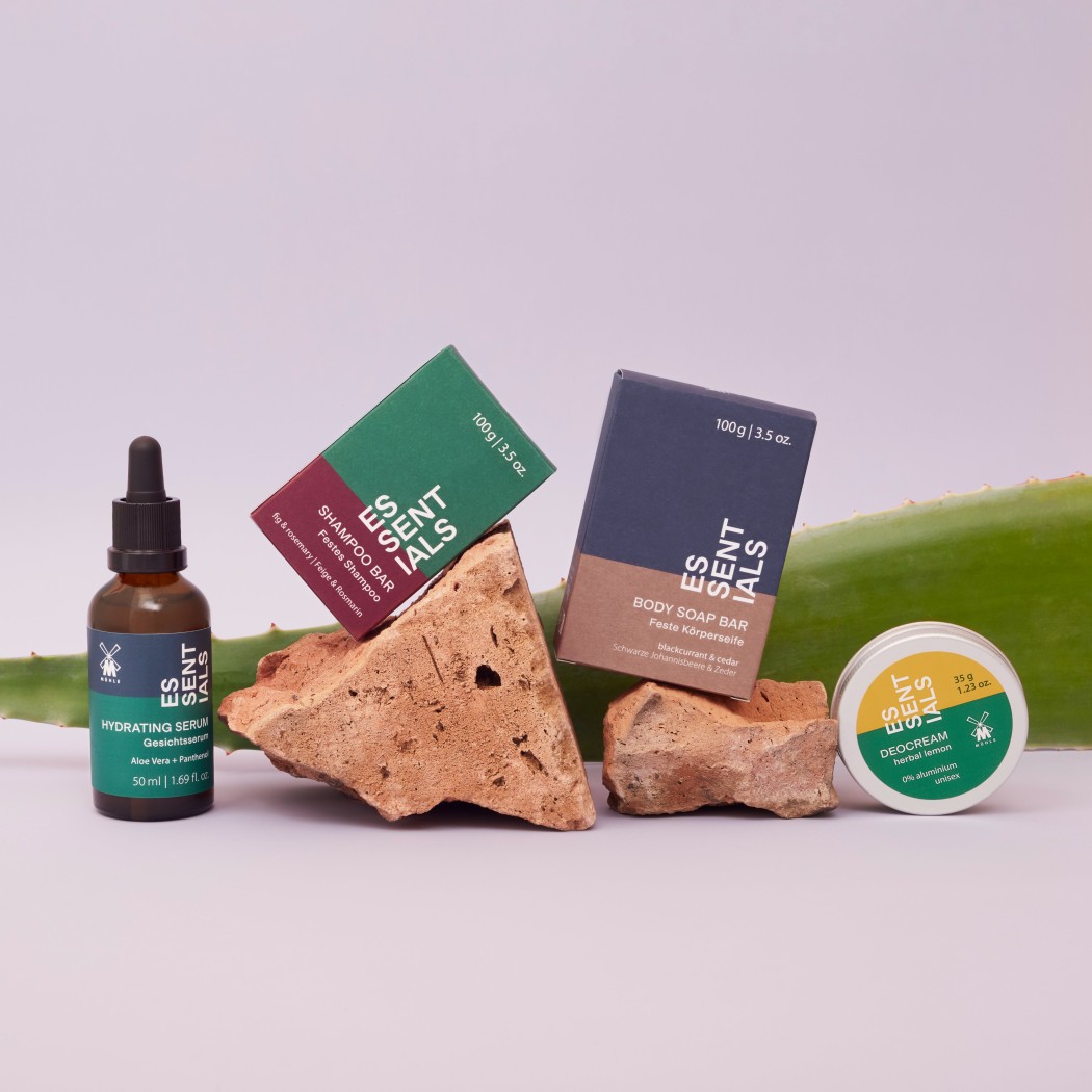 ESSENTIALS. Натурално. Сведена до най-необходимото, серията ESSENTIALS от MÜHLE е глътка свеж въздух, която глези всеки. Натуралните съставки оставят след себе си само мека кожа и гладка, добре поддържана коса. Всеки един продукт от тази нова унисекс серия диша разнообразие. Дезодорантът, твърдият шампоан и твърдият сапун за тяло имат свой собствен аромат и цвят. Новият хидратиращ серум няма нужда от никакви аромати. Вместо това, той впечатлява с чистия ефект на алое вера и пантенол.