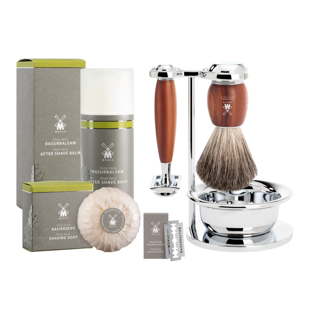 ПОДАРЪЧЕН КОМПЛЕКТ за бръснене MÜHLE VIVO (сливово дърво) + сапун + афтършейв + ножчета